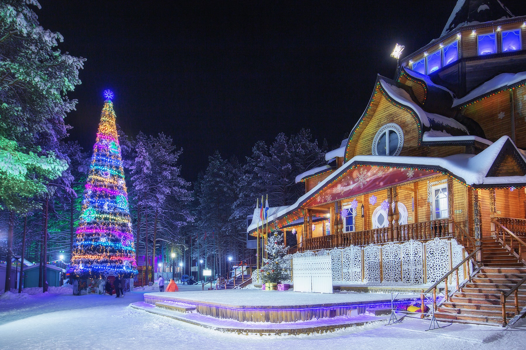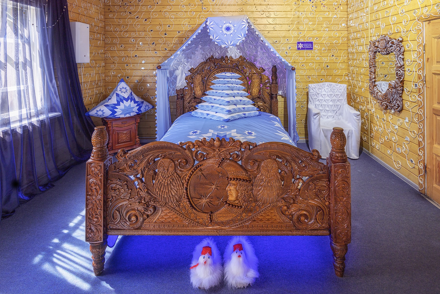 Вы сможете получить настоящее удовольствие от прогулки по бору и тропе сказок. В своей сказочной резиденции ждет встречи с вами сам белобородый кудесник – Дед Мороз и его помощники. В доме Деда Мороза гости смогут набраться мудрости, загадать заветное желание, посмотреть удивительную коллекцию подарков, посетить волшебную обсерваторию и библиотеку, увидеть деревянную кровать зимнего кудесника и заглянуть в волшебное зеркало.